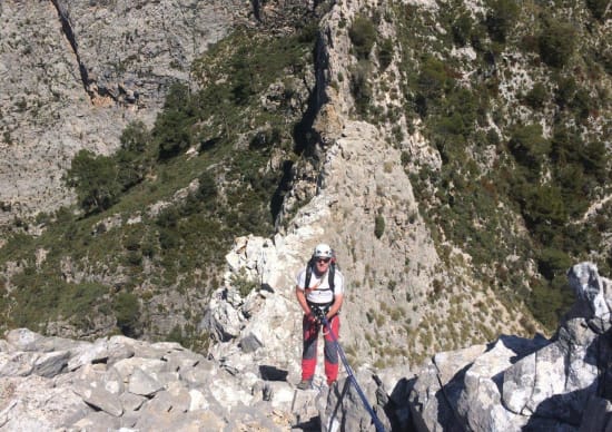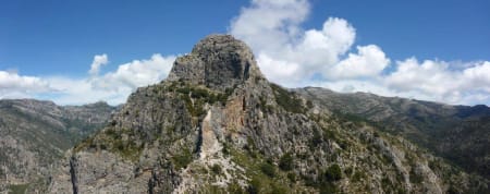 It forms part of a north-south ridge and is much visited, being on a popular walking route behind the town of Nerja. I walked this route in January 2015 and impressive as the Almendrón is, I was more intrigued by its little brother, Almendrillo. From the path I thought I could see a stone cairn on the summit and there appeared to be three possible routes of ascent: the first via the north ridge, the second via the much steeper east ridge and the third via the precarious-looking south ridge. Whichever route was taken, it would require a rope of at least two people and more than a little nerve.