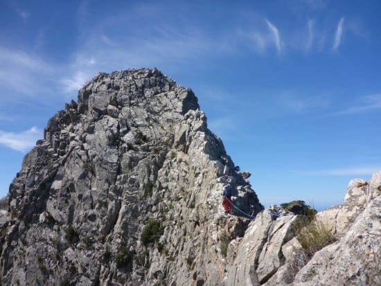 Progress was slow as every hand and foot hold had to be checked for soundness. Several lumps of rock came away in our hands and they were carefully discarded on the east side. We reached our first belay and secured ourselves to a solid spike of rock. From there the ridge rose sharply up to what appeared to be a pile of loose rock with no way around it. It looked impossible but Felipe grittily led on and managed to get some protection into cracks in the face. Gently and carefully he hauled himself over the top and declared that it looked a lot worse than it actually was. Encouraged by his words I followed and it was a relief to reach the relative security of the next belay.